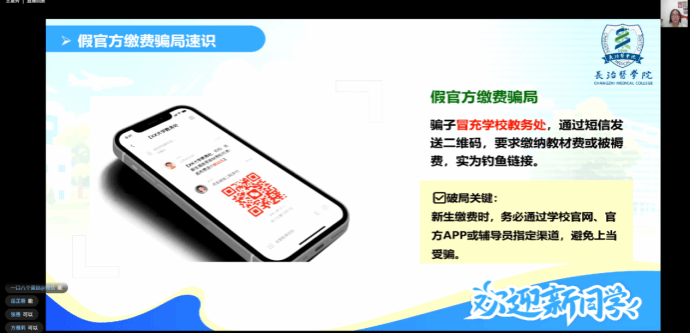 2025级新生辅导员王慧秀围绕“新生为何成为诈骗目标、常见诈骗类型剖析、防骗三不原则以及被骗后的应对措施”四个部分,通过真实案例提醒新生保持警惕,牢记“天上不会掉馅饼,涉及钱财须谨慎”。